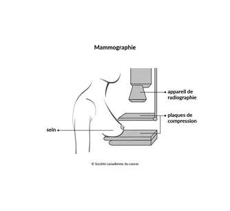Vous vous tenez debout devant l’appareil de mammographie et on place votre sein entre deux plaques de compression en plastique. On referme ensuite les plaques l’une contre l’autre de façon à aplatir, ou comprimer, le sein, puis le technologue en radiologie prend des images. Cette compression rend les tissus internes du sein plus visibles et les images plus claires. Elle permet aussi d’émettre moins de radiations.