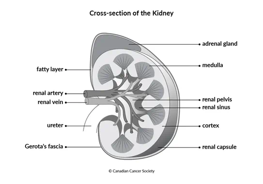 Gerota’s fascia is a thin, fibrous tissue on the outside of the kidney. Below Gerota’s fascia is a layer of fat.