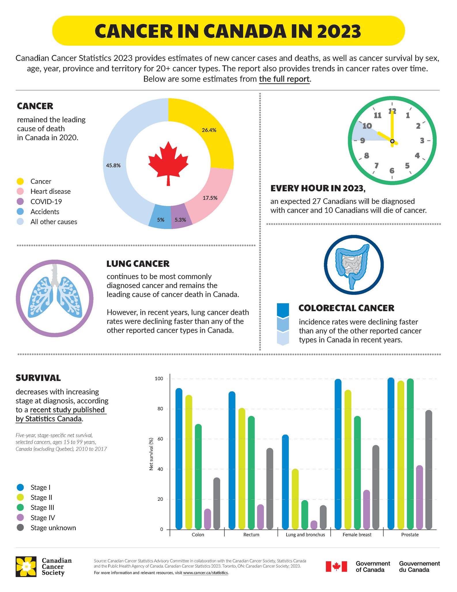 Material in this publication may be reproduced with the following suggested reference: Canadian Cancer Statistics Advisory Committee in collaboration with the Canadian Cancer Society, Statistics Canada and the Public Health Agency of Canada. Canadian Cancer Statistics 2023. Toronto, ON: Canadian Cancer Society; 2023. Available at: cancer.ca/Canadian-Cancer-Statistics-2023-EN (accessed [date]).