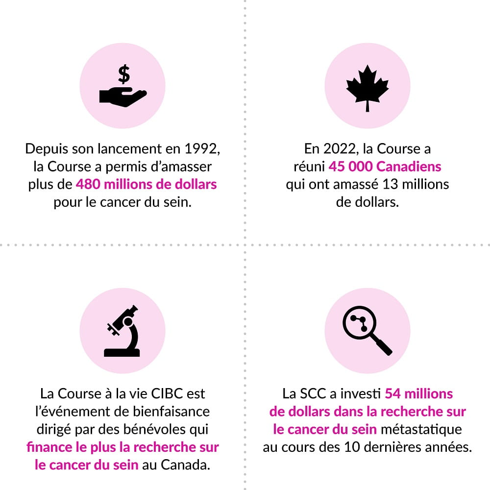La Course à la vie CIBC de la Société canadienne du cancer est née d’un puissant désir d’agir pour les personnes qui sont ou ont été atteintes d’un cancer du sein.