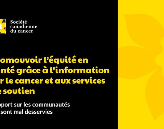 La SCC a publié un document intitulé Promouvoir l’équité en santé grâce à l’information sur le cancer et aux services de soutien : Rapport sur les communautés qui sont mal desservies. Ce rapport décrit les lacunes, les obstacles et les défis auxquels font face 10 communautés identifiées comme étant mal desservies, dont les personnes âgées atteintes de cancer. Il donne des indications sur la manière de mieux s’engager auprès de ces communautés et d’améliorer le soutien qui leur est offert, car leurs membres méritent d’avoir accès aux soins contre le cancer comme toutes les personnes au Canada.