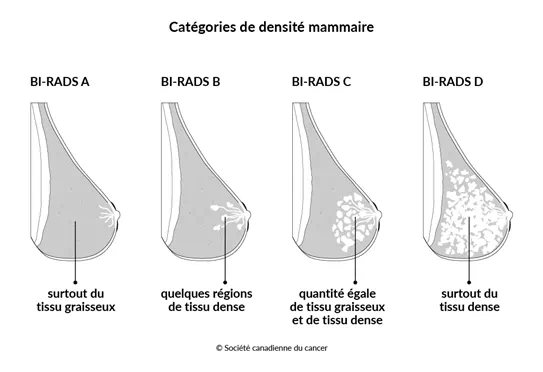 De nombreux hôpitaux et cliniques au Canada ont recours à la classification du Breast Imaging Reporting and Data System (BI-RADS), qui a été conçu par l’American College of Radiology, pour consigner les résultats de la mammographie. Le système BI-RADS permet de classer la densité mammaire dans l’une ou l’autre des 4 catégories, soit A à D. Ces catégories décrivent la quantité de tissu graisseux ou de tissu dense dans vos seins, qui varie de tissu presque entièrement graisseux à tissu dense contenant peu de graisse. La densité augmente en fonction du rang de la lettre.